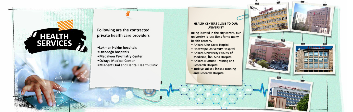They can benefit from the state and private health institutions within the scope of Health Services. In addition, our university, signing bilateral protocols with some private health institutions, enables our students and our staff to benefit from the discounted health services. The following healthcare centers are among the health institutions that are agreed on behalf of the authority.